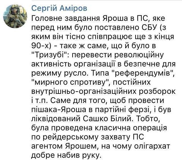 На самом деле события 31 августа были для Лесника лишь формальным предлогом объявить о своем выходе из «Правого сектора». Он уже давно и серьезно критиковал кума Наливайченко Яроша, которого считал спускным клапаном радикальных настроений в народе, действующим в угоду СБУ и власти.