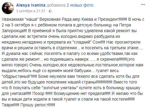 "Я думала нас сейчас поселят в палату со всеми удобствами, так как сделали же ремонт. Но поднявшись наверх, я о*ренела! Очень холодно, все недовольные, постельное, которое нам выдали, небось ещё со времён моей бабушки. Туалет весь "обд*ыстаный". Боже, неужели вам тяжело все сделать хотя бы для детей - это же будущее поколение нашей страны. Вместо того, что бы покупать себе "золотые унитазы" купите хоть в больницу крышку для унитаза. Позор. Возмущению нет предела. Я желаю, чтобы вы и ваши дети ходили в такой туалет и спали на такой постели. Твари", - пишет она.