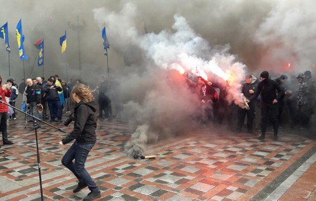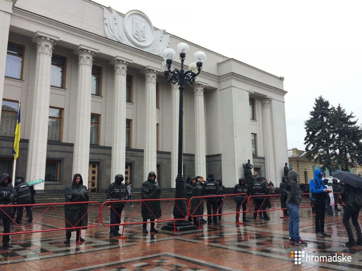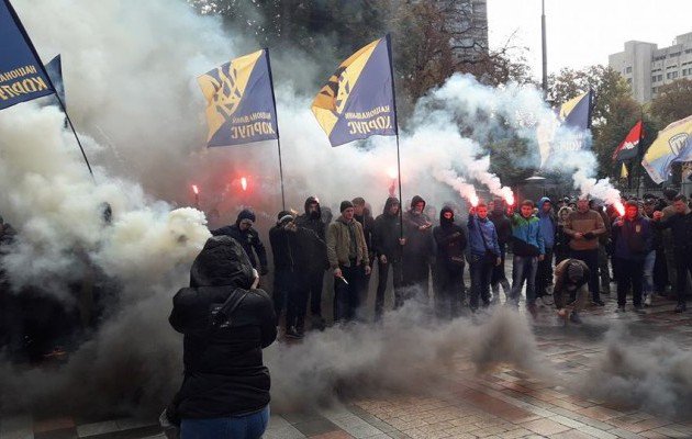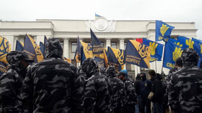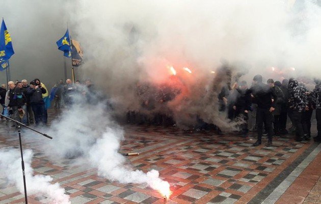 Члены ВО «Свобода», «Национального корпуса» и «Правого сектора» устроили митинг у здания Верховной Рады Украины. Активисты выступают против законопроектов о продлении особого статуса Донбасса, которые предложил президент.