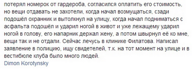 Дмитрий Коротинский находился в развлекательном заведении вместе с женой, но когда собрались уходить, обнаружили пропажу номерка из гардероба и не смогли забрать свои вещи. Охранник неадекватно отреагировал на ситуацию и избил мужчину.