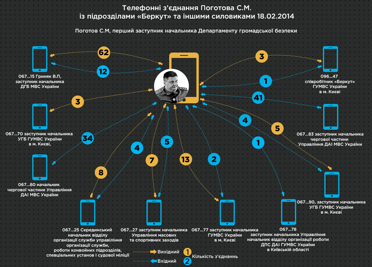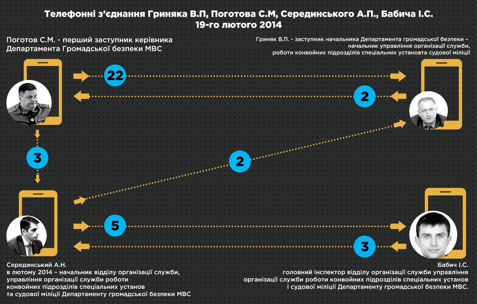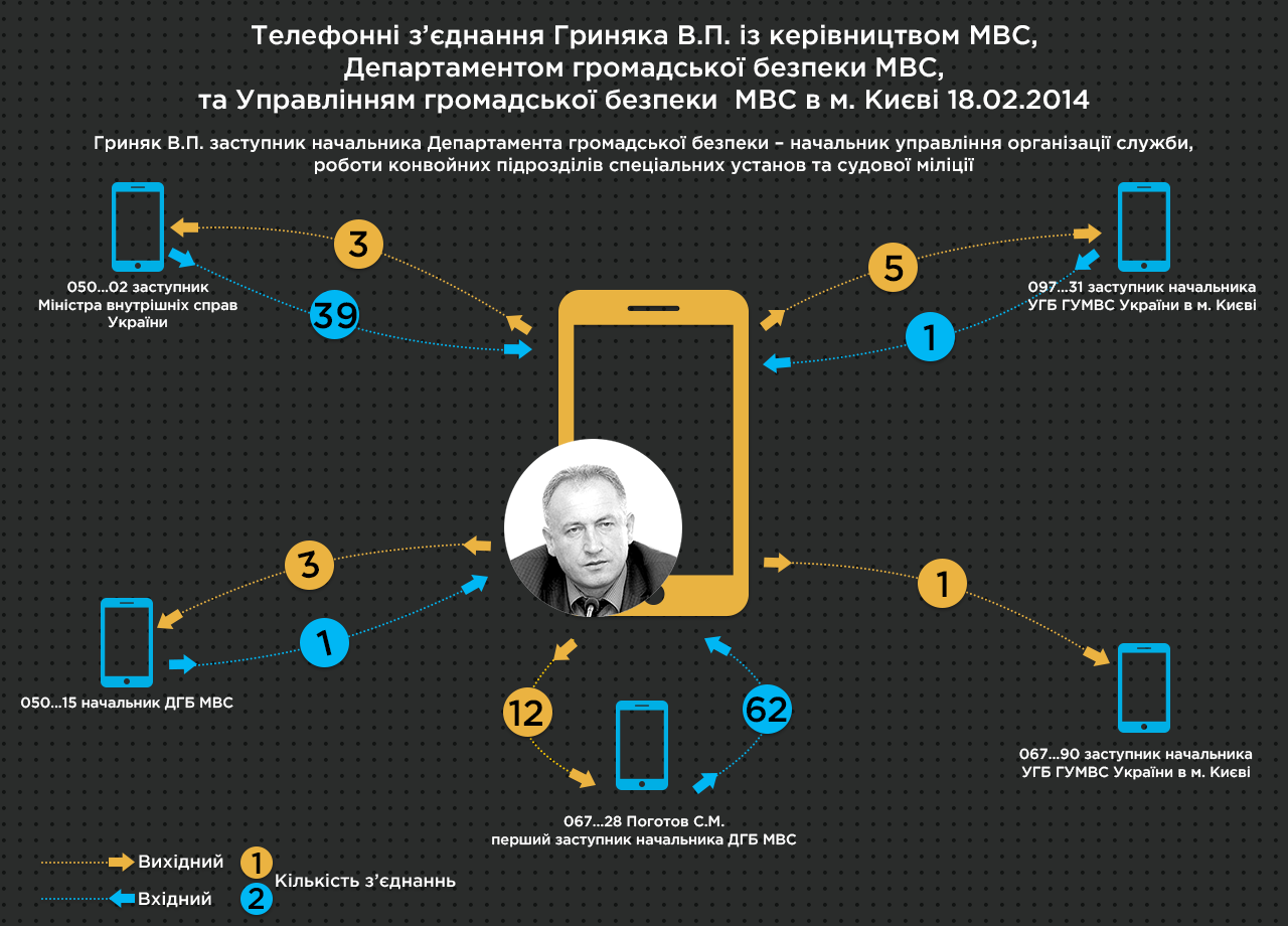 Гриняк получил 39 звонков от заместителя министра внутренних дел, а также более полусотни звонков от своего прямого руководства. Общался он и с управлением общественной безопасности Киева. Исходящих от Гриняка было не так много. Указания для «Беркута», говорят следователи, он в основном передавал через Серединского и Бабича.