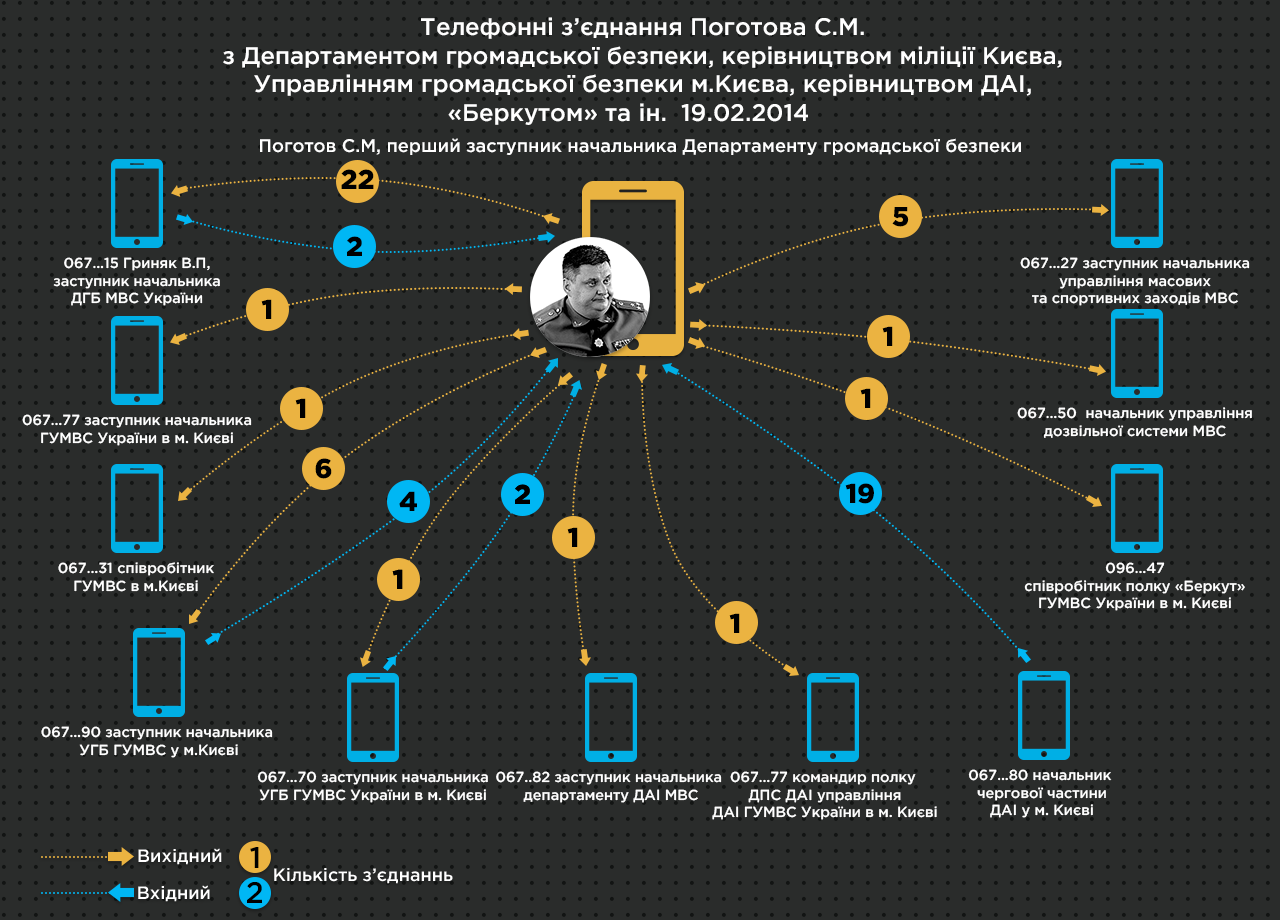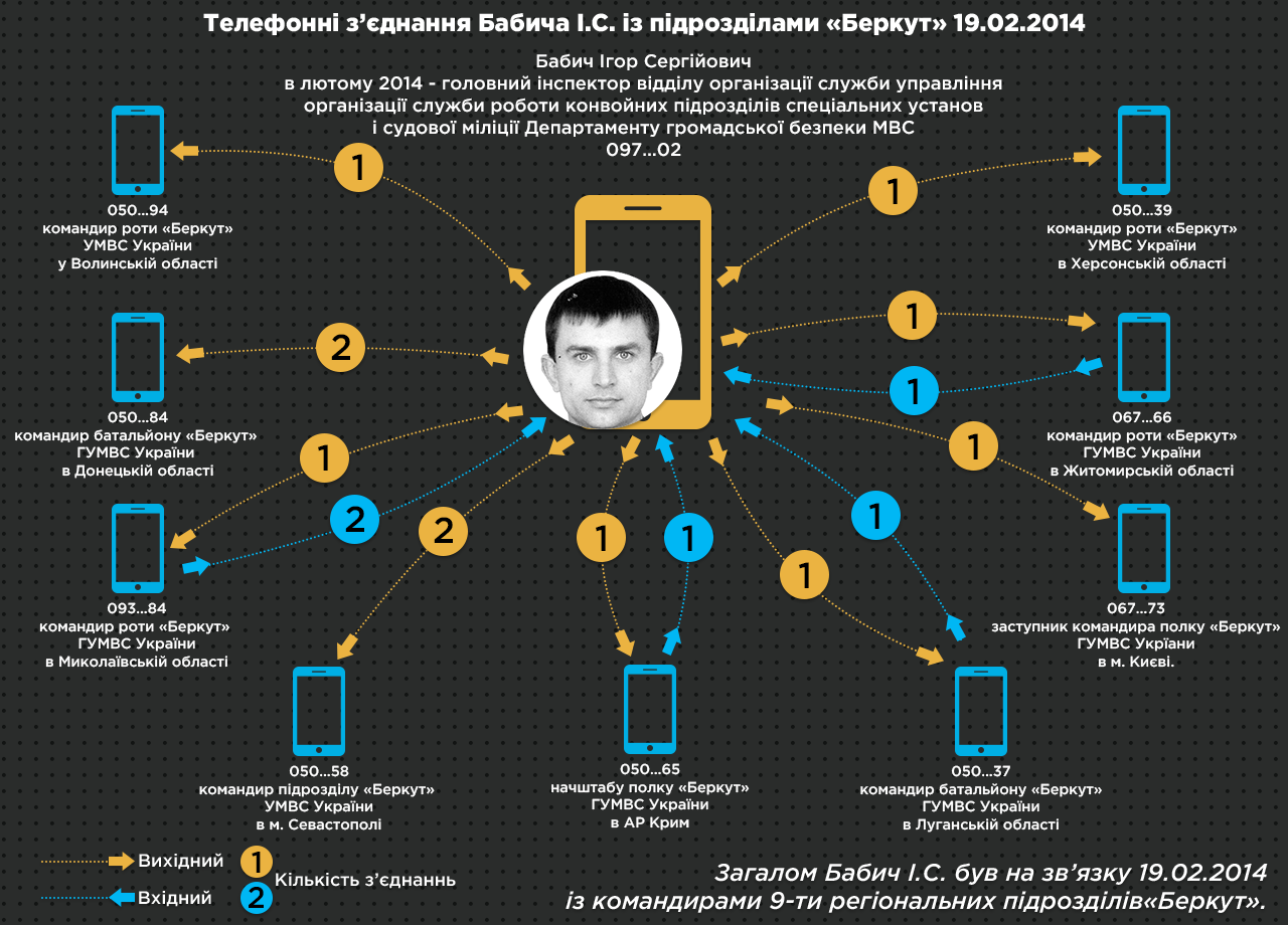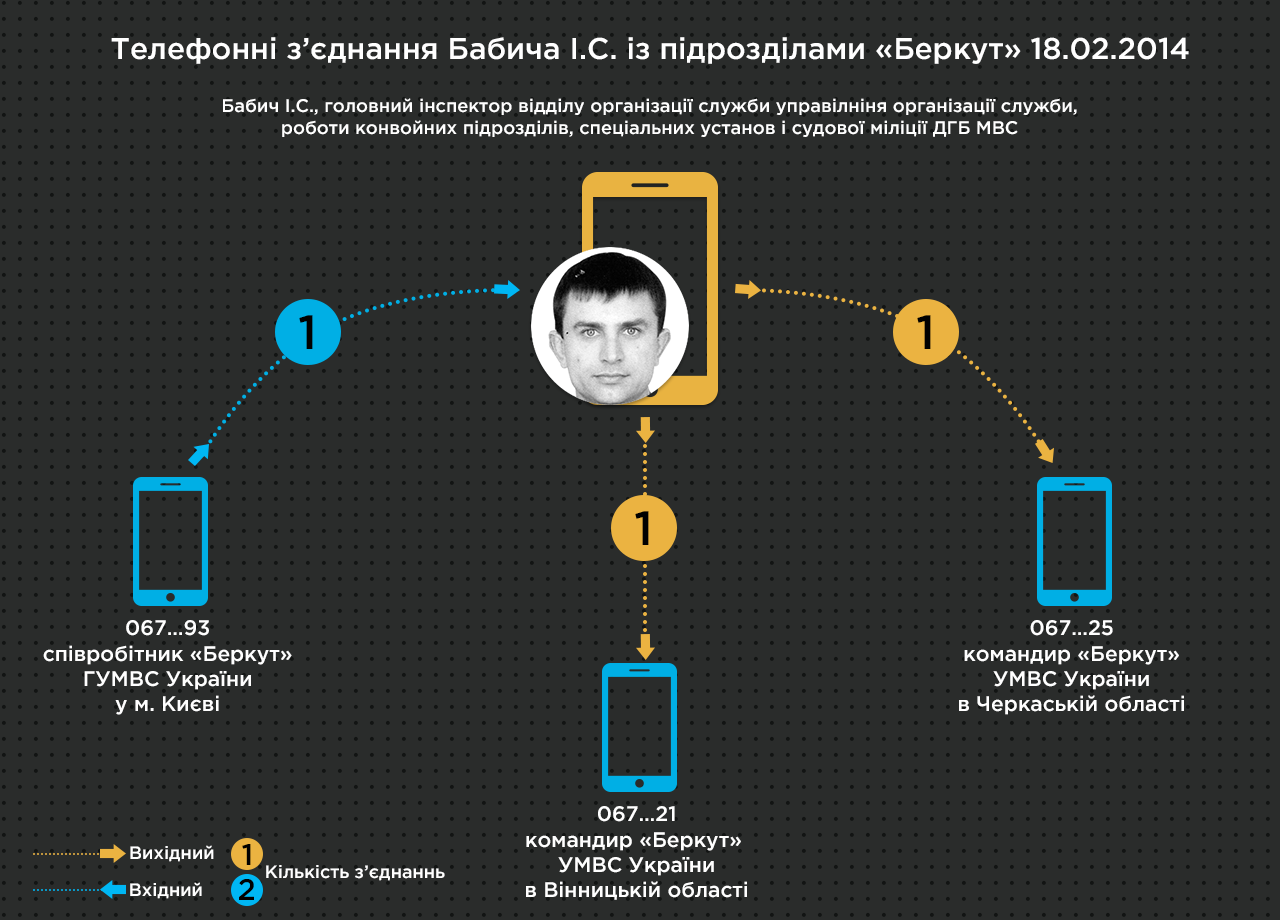 Гриняк получил 39 звонков от заместителя министра внутренних дел, а также более полусотни звонков от своего прямого руководства. Общался он и с управлением общественной безопасности Киева. Исходящих от Гриняка было не так много. Указания для «Беркута», говорят следователи, он в основном передавал через Серединского и Бабича.