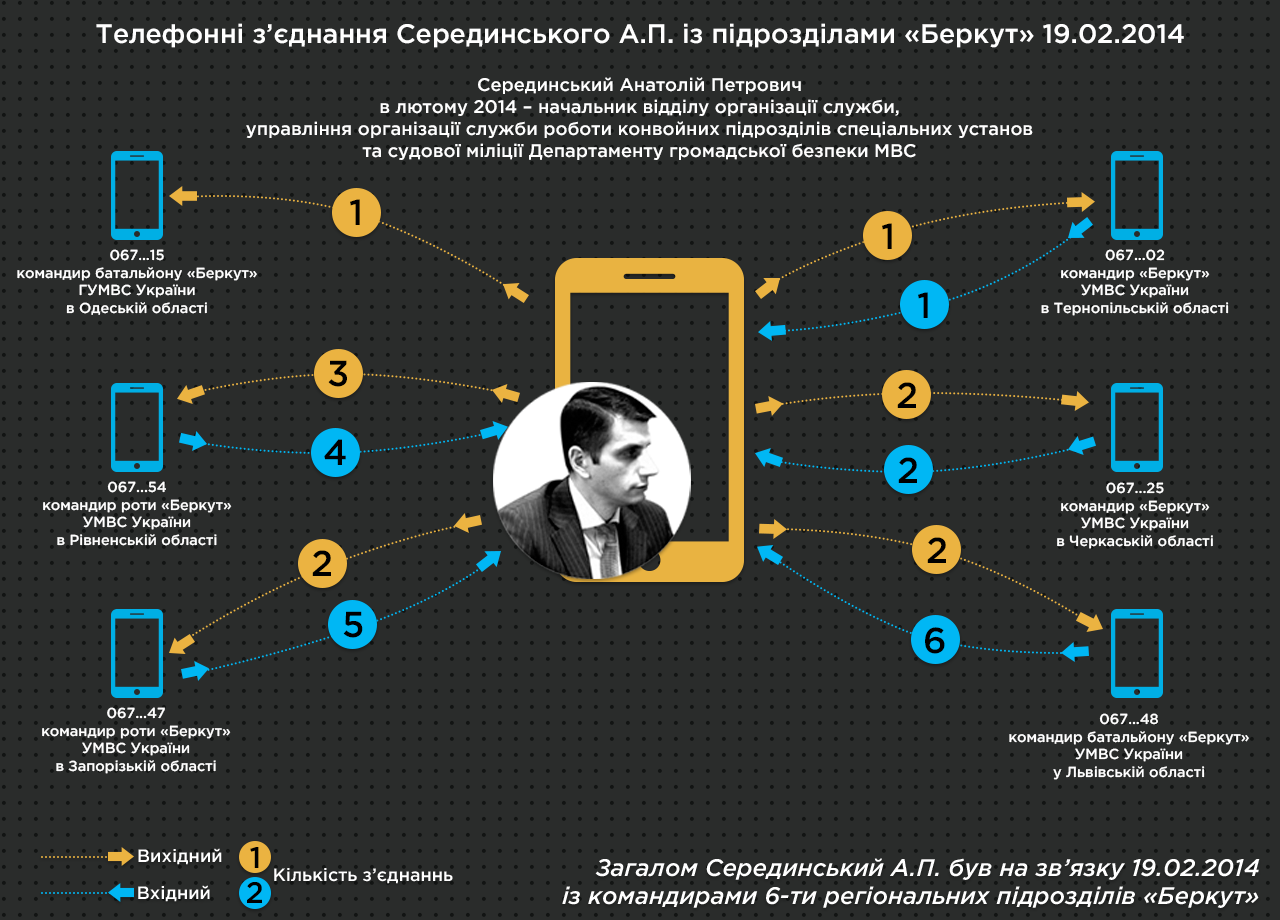 В то же время подозреваемый Серединский контактировал с семью командирами подразделений «Беркута», руководством своего Департамента и киевской милицией:
