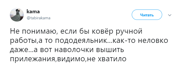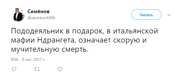 "Пододеяльник в подарок, в итальянской мафии Ндрангета, означает скорую и мучительную смерть", - отметил пользователь под ником Семенов.