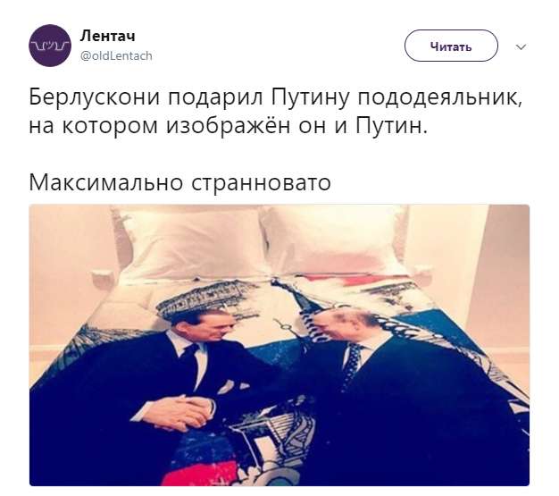 Бывший премьер-министр Италии Сильвио Берлускони подарил на день рождения президента России Владимира Путина вышитый пододеяльник размера king-size.