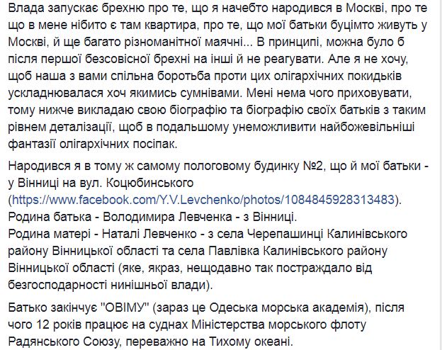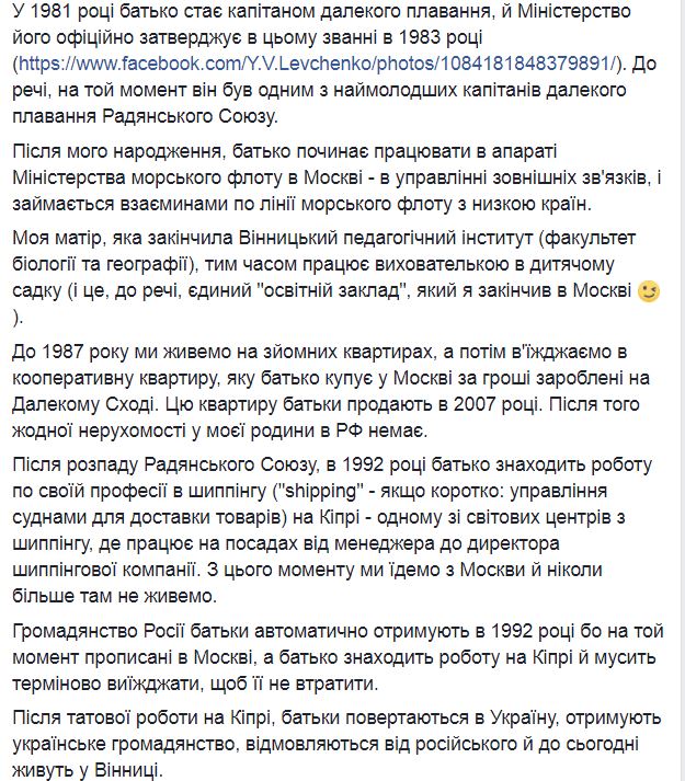 "После моего рождения, отец начинает работать в аппарате Министерства морского флота в Москве - в управлении внешних связей и занимается отношениями по линии морского флота с рядом стран. Моя мать, которая закончила Винницкий педагогический институт (факультет биологии и географии), между тем работает воспитательницей в детском саду (и это, кстати, единственный "образовательное учреждение", который я закончил в Москве). До 1987 года мы живем на съемных квартирах, а потом въезжаем в кооперативную квартиру, которую отец покупает в Москве за деньги заработанные на Дальнем Востоке. Эту квартиру родители продают в 2007 году", - написала Левченко.