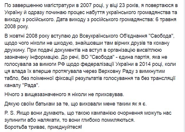 Также он написал, что возрасте 23 лет приехал в Украину начал процесс получения украинского гражданства и выхода из российского. Дата выхода из российского гражданства 6 мая 2008 года.