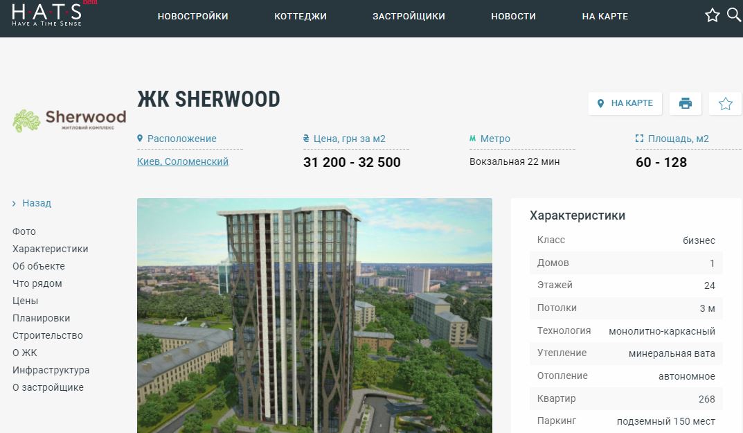 На сайтах по продажи недвижимости указано, что квадратный метр в жилом комплексе "Шервуд", который находится в Соломенском районе города Киева, стартует от 31 200 грн.