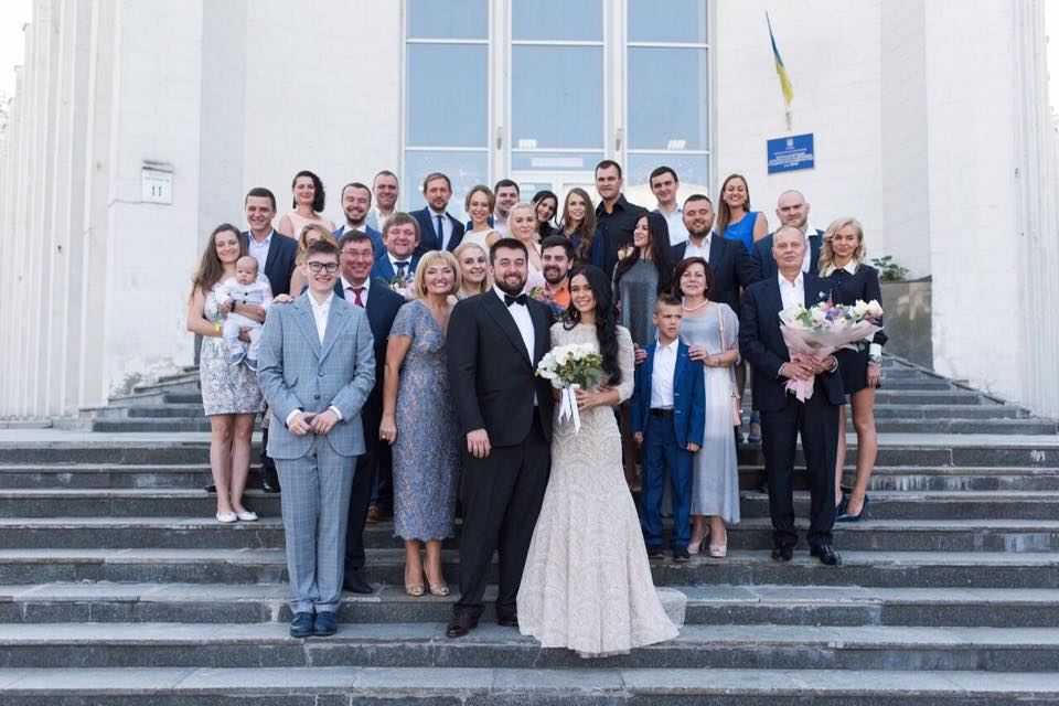 Общий свадебный снимок на фоне загса, фото: facebook.com