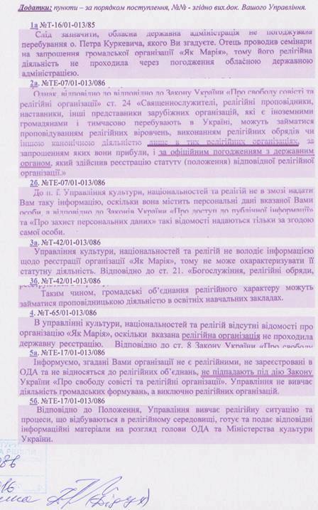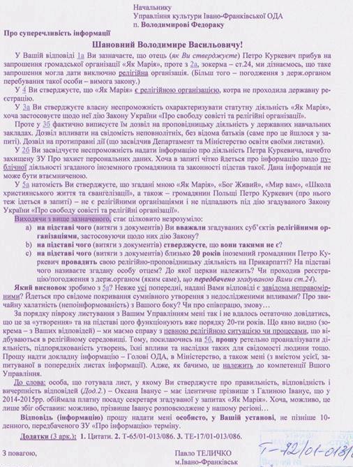 Управління культури ІФ ОДА своїм листом ТЕ-17 від 19.08.2016 повідомило, що згадані «організації» не релігійні, не зареєстровані в ОДА, не відносяться до релігійних об’єднань.