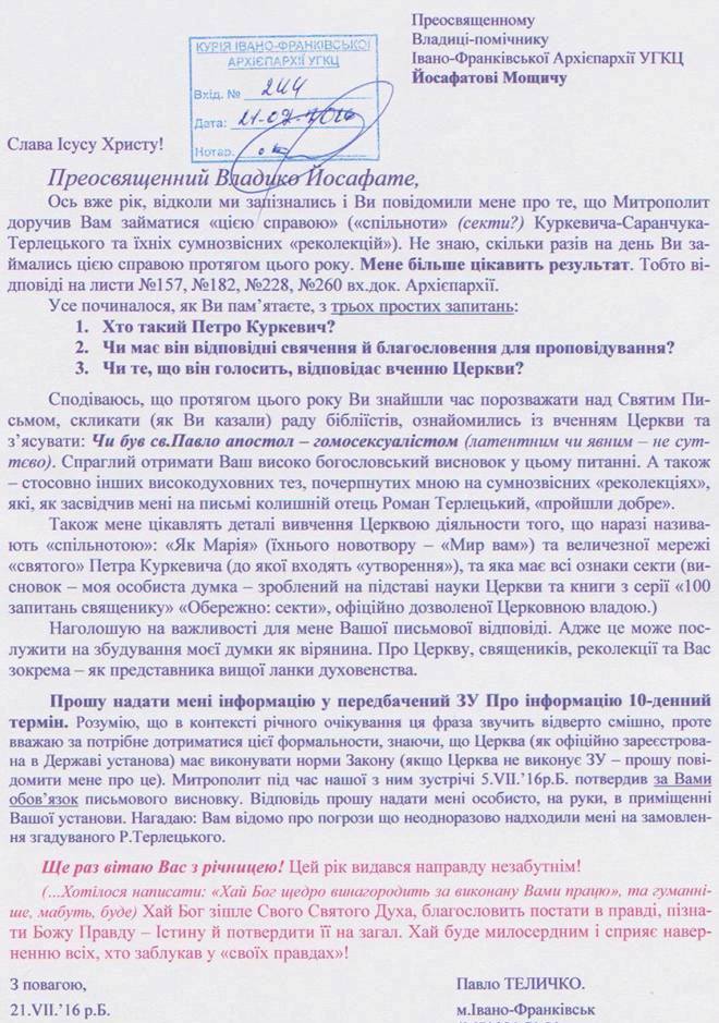 Журналіст Павло Теличко неодноразово звертався за роз’ясненнями в Архієпархіяльне  управління, але жодної відповіді на свої звернення не отримав. Єдине, що вдалося з’ясувати при особистій зустрічі з Владикою Мощичем, так це те, що за більш, ніж 15 років «гастролів» Петра Куркевича Україною, в УГКЦ немає жодного офіційного документа на цього «святого».
