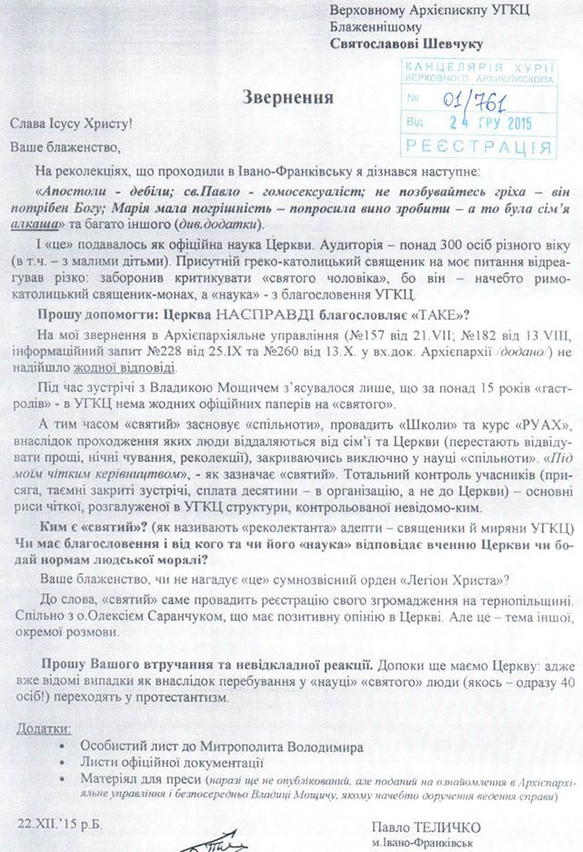 Тотальний контроль учасників, присяга, таємні закриті зустрічі, сплата десятини в організацію, а не в Церкву – все це, за словами Павла Теличка має місце в структурі, яка діє під «дахом» УГКЦ і контролюється невідомо звідки і невідомо ким.