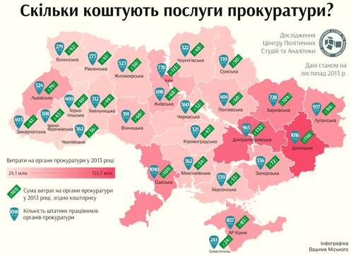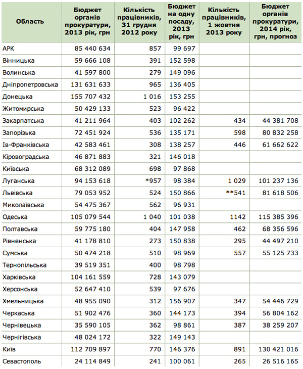 В останньому стовпчику наведеної таблиці, маючи під рукою дані щодо чисельності кількох обласних прокуратур, автор спробував вирахувати приблизні потреби в коштах на 2014 рік. Варто зазначити, що отримані показники досить умовні, адже кількість прокурорів після 1 жовтня 2013 року може зрости.