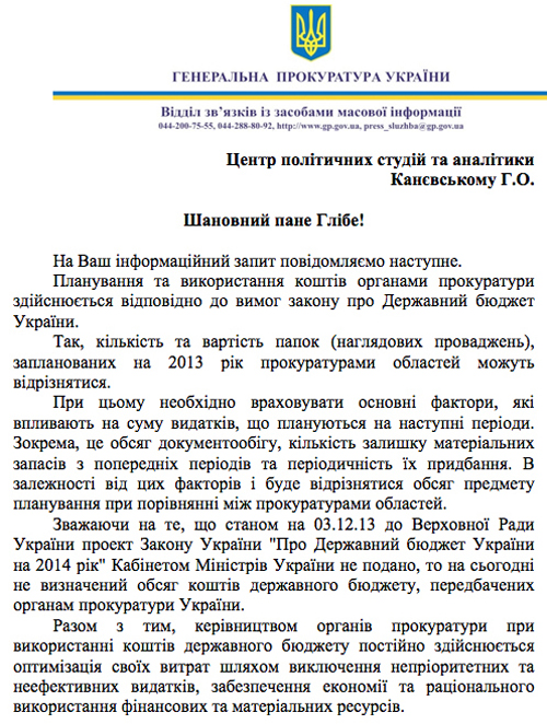 З цією метою в обласні прокуратури були надіслані запити про надання розрахунків до кошторисів 2013 року.