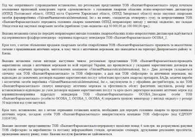 Во время оперативного сопровождения установлено, что региональные представители ООО «Валеант Фармасьютикалз» перед началом оглашения предложений конкурсных торгов «договариваются» с главными врачами областных психоневрологических диспансеров (ОПНД Полтавской области, ОПНД Стрелечья Харьковской области, ОПНД Запорожской области) по закупке лекарственных средств фармпроизводителя Valeant Pharmaceuticals International, Inc. на определенную, «заранее оговоренную» сумму. За это представители ООО «Валеант Фармасьютикалз» передают главным врачам указанных ОПНД неправомерную выгоду в виде «откатов», что составляет 30% от закупки лекарственных средств (примерные суммы «откатов» от 30 000,00 до 100 000,00 грн.). Указанная незаконная схема по передаче неправомерной выгоды главным врачам областных психоневрологических диспансеров происходит под руководством филдфорсменеджера — руководителя подразделения менеджеров ООО «Валеант Фармасьютикалз» — такие данные указаны в ходатайстве, которое следователь Нацполиции недавно подал в Днепровский районный суд Киева. Последний удовлетворил его, разрешив следственной группе получить доступ к информации о финансовых проводках по счетам «Валеант Фармасьютикалз» в Ситибанке.
