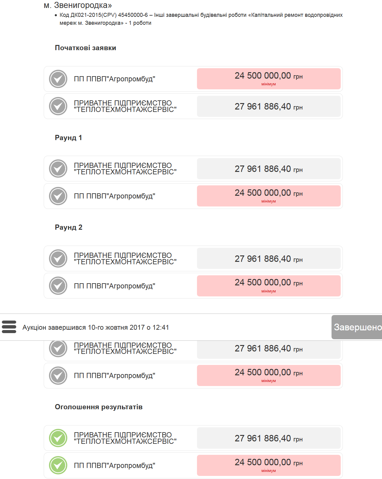 Оскільки конкуренти зовсім не торгувалися, аукціон, схоже, був формальною процедурою. Упродовж трьох турів вартість робіт в обох підприємств-учасників не змінилася ні на гривню.