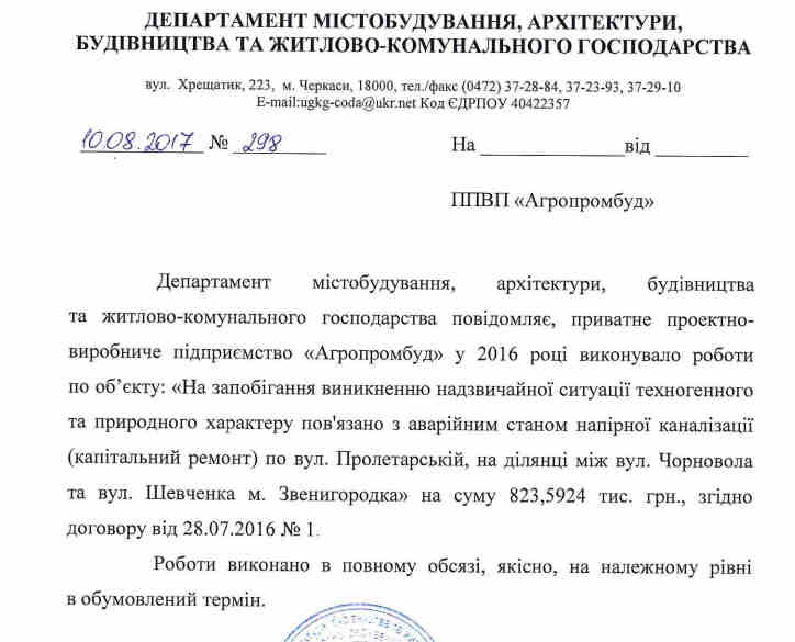 Відгук на роботи «Агропромбуду» надав Департамент містобудування, архітектури, будівництва та житлово-комунального господарства Черкаської ОДА. Згідно з цим документом та договором будівельного підряду, минулого року у Звенигородці ПП доволі успішно освоїло 823 тис. грн. на капремонт водонапірної каналізації.