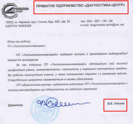 Як бачимо, саме це приватне підприємство надало позитивний відгук про роботу ПП «Тепломонтажтехсервіс».