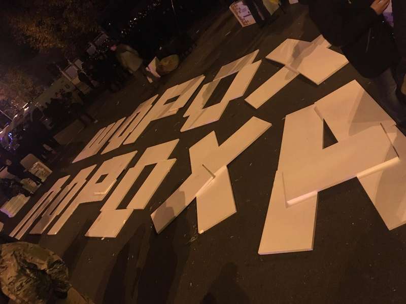 Ночь прошла спокойно - активисты развлекались составлением надписей на асфальте из пенопластовых плит.