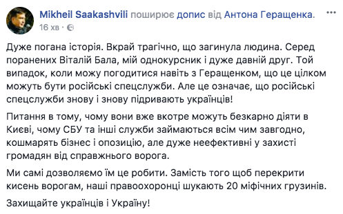 "Судя по всему мощность взрыва былое не менее 1 килограмма в тротиловом эквиваленте. (...) Одна из версий следствия в числе прочих - действия российских спецслужб по дестабилизации общественно политической ситуации на фоне акций протеста", - отметил советник министра.