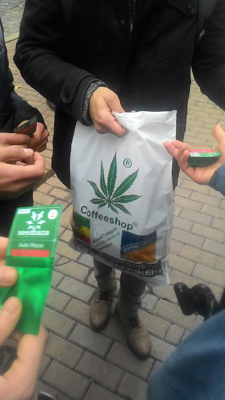 Сам митинг начался без происшествий, под эмбиент-музыку зачитывают требования участников марша. Всем участникам акции прямо на улице раздают пакетики с семенами конопли.