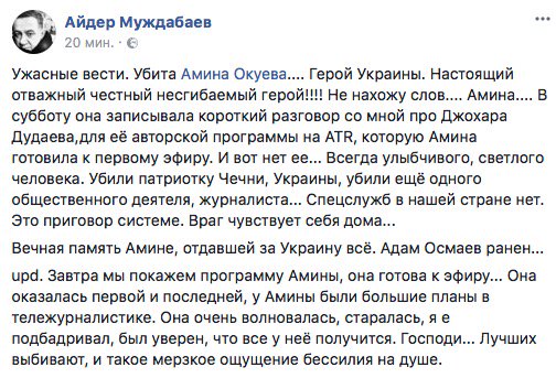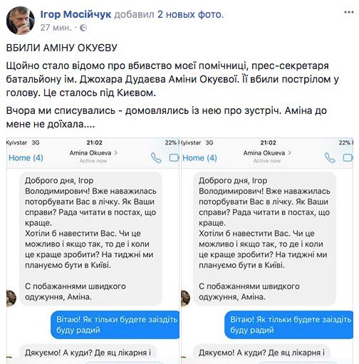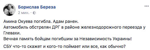 Волонтеры, политики и журналисты шокированы убийством Амины Окуевой и ранением Адама Осмаева на железнодорожном переезде у поселка Глеваха под Киевом.