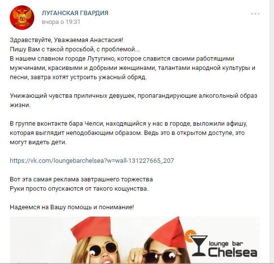 "Ночной клуб в неподконтрольном Алчевске разместил рекламу: "Водку за пилотку". А движуха Насти "еб*ться за дедов" Пятериковой ужаснулась и решила наложить вето на рекламу, а также, общественное порицание, анафему и табу Лехи Мозгового (Да святятся мощи его сгоревшего джипа)", - отметил Спирин.