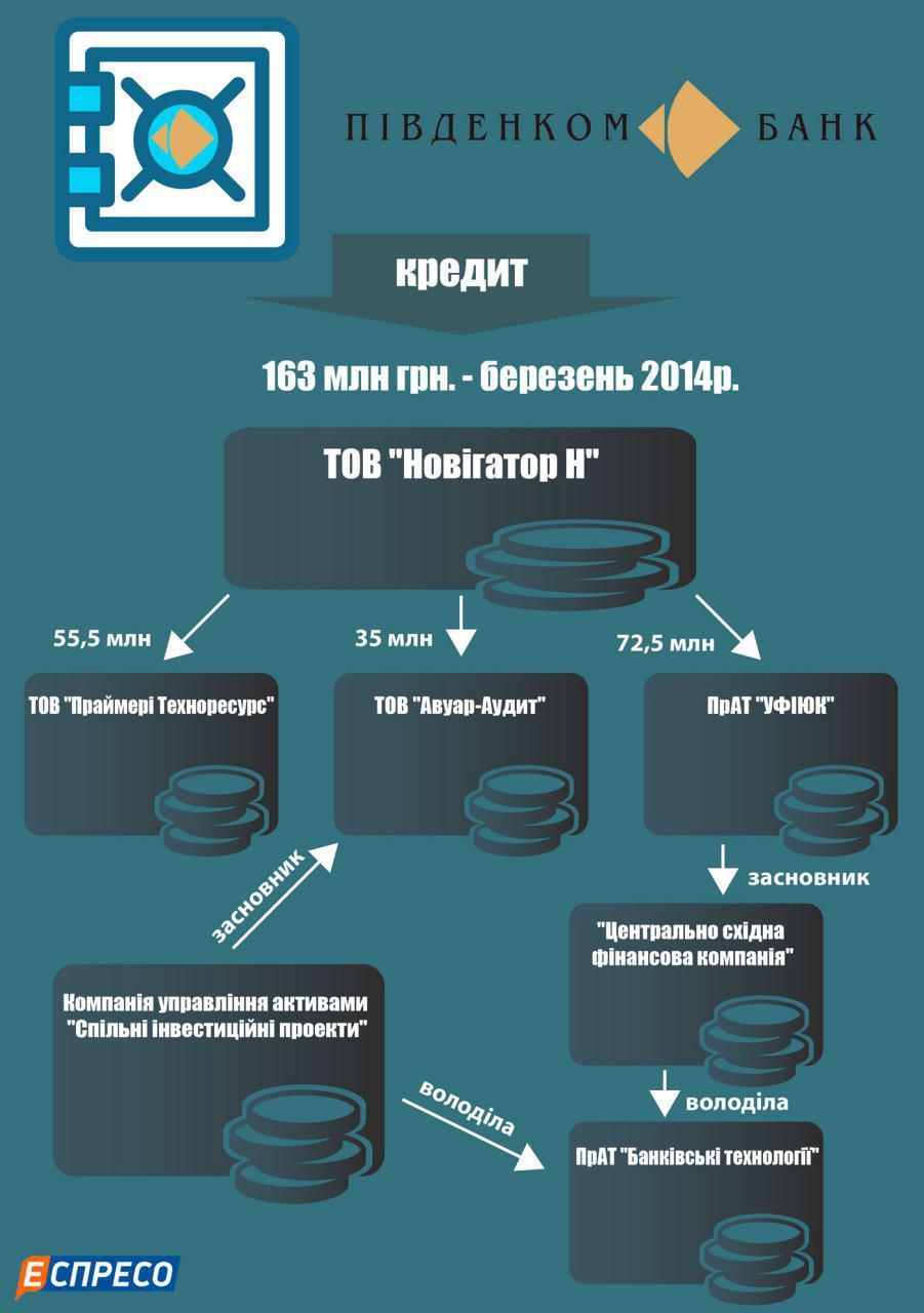 Данная финансовая схема работала и после завершения Революции Достоинства. Так, «Южкомбанк», который тогда еще работал, в марте 2014 года выдал кредит «Новигатору Н» в размере 163 миллионов гривен. Тот, в свою очередь, перечислил эти средства ООО «Праймери Техноресурс» (55,5 млн), ООО "Авуар-Аудит"(35 млн) и ЧАО "УФІЮК«(72,5 млн), которые также связаны с Цыплаковым (см. инфографику).