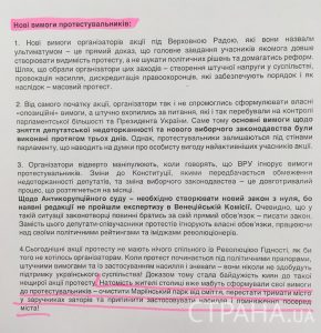 Технологи Банковой советуют говорить, что организаторы так и не смогли сформулировать четких требований к власти. В то же время, в темниках отмечают, что основные требования организаторов акции – ограничение депутатской неприкосновенности, изменение ЦВК, избирательного законодательства, усиление боробы с коррупцией – одно из приоритетных заданий, над которыми работает коалиция при активной поддержке президента.