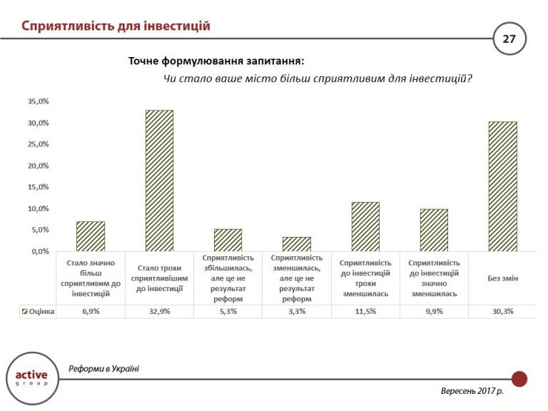 Результаты опроса экспертов показали, что 6,9% опрошенных ответили, что их город стал значительно более благоприятно к инвестициям. 32,9% сказали о незначительное улучшение инвестиционной привлекательности города.