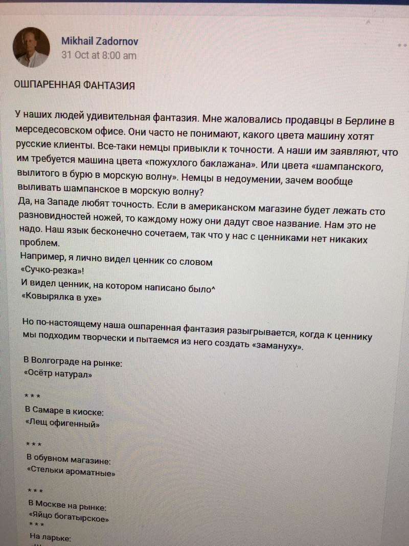 «У наших людей удивительная фантазия. Мне жаловались продавцы в Берлине в мерседесовском офисе. Они часто не понимают, какого цвета машину хотят русские клиенты. Все-таки немцы привыкли к точности. А наши им заявляют, что им требуется машина цвета «пожухлого баклажана». Или цвета «шампанского, вылитого в бурю в морскую волну». Немцы в недоумении, зачем вообще выливать шампанское в морскую волну?», — написал Задорнов.