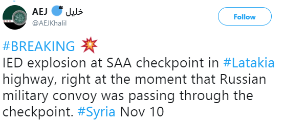 Инцидент произошел на блокпосте сирийских правительственных сил в тот момент, когда через него проходил военных конвой России.