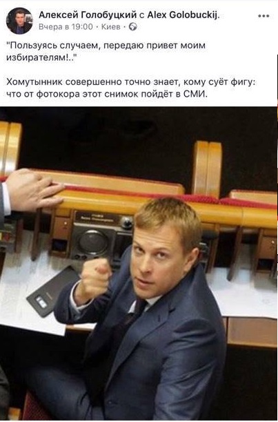 "Пользуясь случаем, передаю привет моим избирателям!.Хомутынник совершенно точно знает, кому сует фигу: от фотокора этот снимок пойдёт в СМИ", - написал в своем блоге политолог Алексей Голобуцкий.
