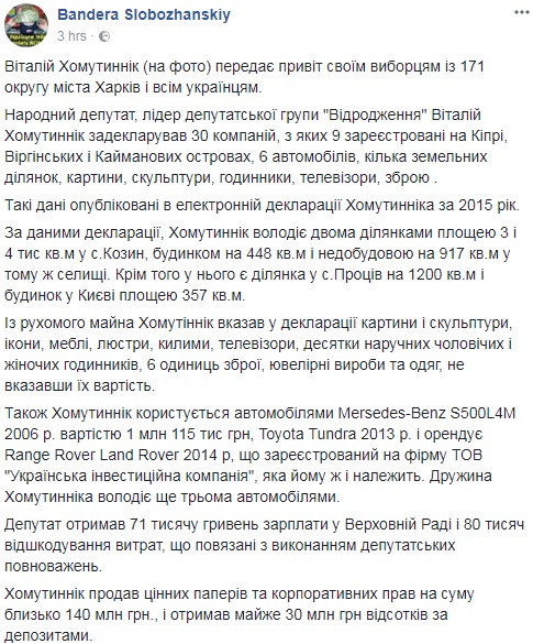 Кроме этого, блогеры вспомнили о том, что Хомутынник является самым богатым депутатом Верховной Рады. О его состоянии подробно написала у себя на странице в Facebook Bandera Slobozhanskiy: