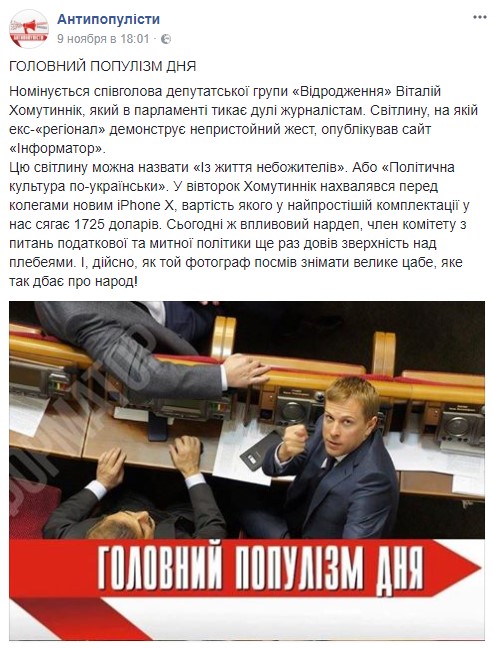 Благодаря своему похабному поступку депутата назвали “популистом дня”, напомнили о его состояниях и о том, что Хомутынник пришел в Совет с новым iPhone. Depo разметило ряд фотожаб как депутат Хомутынник последний iPhone рекламировал.
