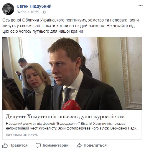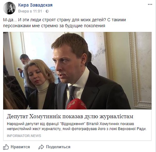 Особенно, пользователи Facebook засыпали комментариями фото народного депутата Хомутынника, на котором он показывает дулю журналистам.