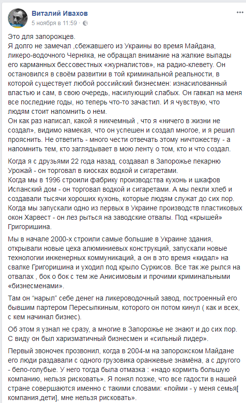 И что ему не сидится в своей Москве? Что ему делать в Украине и в частности в Запорожье, которое он презирает и советует всем отсюда валить? Ну, свести счёты с анисимовскими, ладно. Получить садистское наслаждние от унижения тех, кто унижал его и давал пинки. Ладно. Еще от страха? Страха того,что все заметят, что он не отомстил обидчикам и перестанут его бояться? А ему,выходит, очень страшно ,если другие его не боятся… Ну ладно, этот инфантилизм можно понять. Думаете это все? А зачем опять лезет в политику? Финансирует политков, подкупает чиновников, вмешивается в процессы…