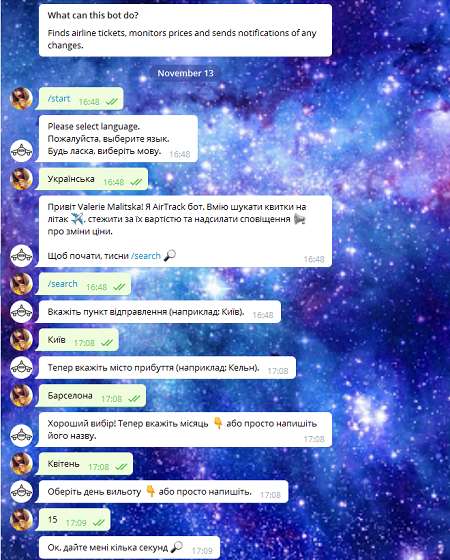 AirTrack мониторит 98% мировых авиакомпаний, в том числе и лоукосты, которые летают в Европу. Все, что нужно путешественнику, — задать нужный маршрут, создать отслеживание ятоимости по данному направлению. В настоящее время бот работает на трех языках: украинском, английском и русском. В дальнейшем его создатели планируют расширить языковой перечень, а также добавить новые поисковые возможности.