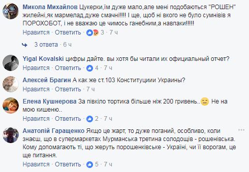"Теперь я понимаю, откуда столько новых магазинов "Рошен". Это же военные объекты. Оборона крепнет!", - отмечают украинцы. Причем, с этим нехитрым умозаключением согласны даже россияне: "У нас в Мурманске этого рошена как собачьего говна в парке. Помогают люди".
