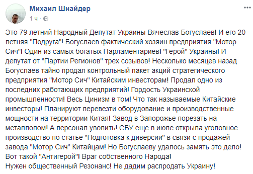Общественный и политический деятель Украины Вячеслав Богуслаев незаконно продал предприятие "Мотор Сич", чем привлек к себе немало внимания в социальных сетях. Соответствующую публикацию сделал Михаил Шнайдер в Facebook.