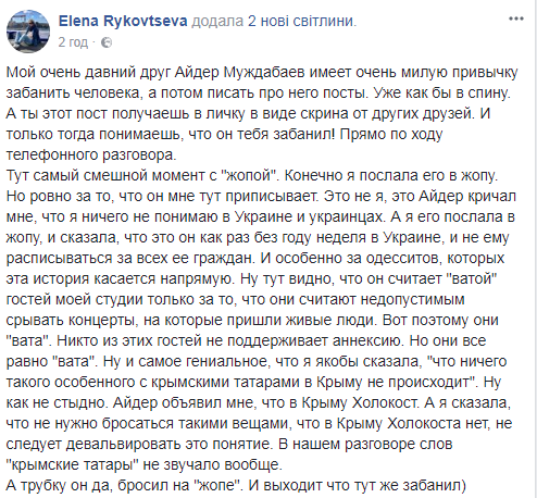 "Тут самый смешной момент с "ж*пой". Конечно я послала его в ж*пу. Но ровно за то, что он мне тут приписывает. Это не я, это Айдер кричал мне, что я ничего не понимаю в Украине и украинцах. А я его послала в ж*пу, и сказала, что это он как раз без году неделя в Украине, и не ему расписываться за всех ее граждан. И особенно за одесситов, которых эта история касается напрямую. Ну тут видно, что он считает "ватой" гостей моей студии только за то, что они считают недопустимым срывать концерты, на которые пришли живые люди. Вот поэтому они "вата". Никто из этих гостей не поддерживает аннексию. Но они все равно "вата".