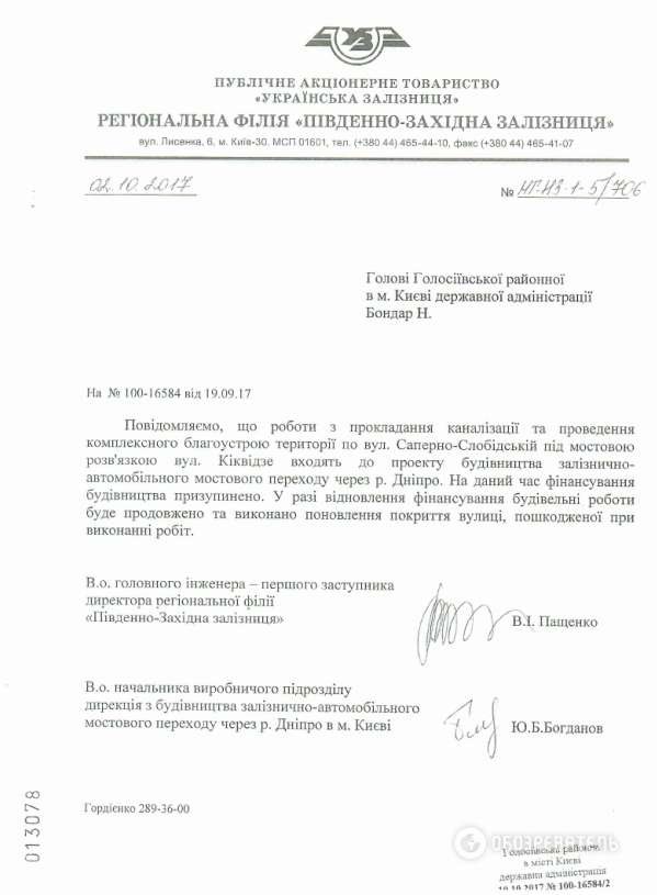 Журналисты "Обозревателя" направили запрос в Киевскую городскую государственную администрацию (КГГА), где нам сообщили, что балансодержателем объекта является дорожно-эксплуатационное управление (ДЭУ) Голосеевского района. В управлении ответили, что виновником разрытия (прокладки канализации) является Дирекция строительства железнодорожно-автомобильного мостового перехода через р. Днепр в г. Киеве - производственное подразделение Юго-Западной железной дороги ПАО "Укрзалізниця".
