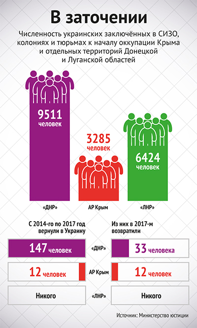 У Министерства юстиции цифры куда более впечатляющие. По его подсчётам, кроме политзаключённых в пенитенциарной системе страны-агрессора до сих пор остаются почти 19 тыс. украинцев. "Все данные, которые у нас есть, — за 2014 год. Наше ведомство как государственный орган исполнительной власти сегодня не может официально решить вопрос возвращения в Украину или содержания украинцев в тюрьмах на оккупированных территориях.