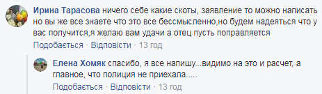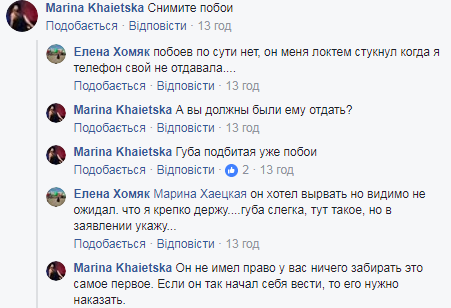 "Я включила камеру и начала его снимать, он начал убегать, когда вопрос стал таким образом... Он попросту начал вырывать у меня телефон, я вызвала полицию... 2, 5 часа ожидания полиции. Четыре или пять звонков с вопросом: "Когда?" Полиция так и не явилась... Итог: разбитый телефон, подбитая губа (заведующий локтем ударил, а лось он здоровый) и отец в коридоре..." - резюмировала Елена Хомяк.
