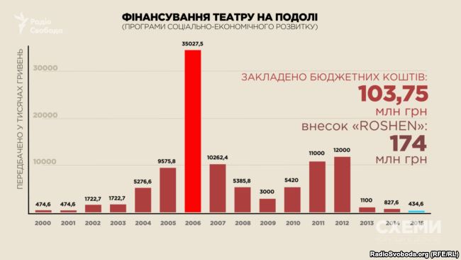 На протяжении 15 лет на реконструкцию театра в бюджете закладывались разные суммы. Меньше в 2014 году - 434,6 тыс. гривен, всего в 2006 г. – 35 млн. Общая сумма с 2000 по 2015 годы составляет 103,75 млн гривен. А это всего на треть меньше 174 млн заявленного взноса “Рошен”.