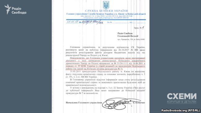 В 2011 году СБУ заявляла о хищении более 2,5 млн гривен при реконструкции. Прошло 6 лет. В СБУ сообщили: “В Главном управлении отсутствует информация о состоянии расследования указанной уголовного дела и возможного привлечения каких-либо лиц к уголовной ответственности. Главным управлением материалы о противоправной деятельности в ходе проведения реконструкции Киевского академического драматического театра на Подоле направлены в прокуратуру Подольского района (сейчас Киевская местная прокуратура №7)”.