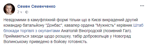 Задержанный сегодня Виногродский - – бывший офицер военно-морского флотаб. В АТО пошел добровольцем. Был командиром батальона "Донбасс" после Семена Семенченко, ушедшего в Верховную Раду, и остался приближенным к новоиспеченному нардепу. Именно под его руководством "Донбасс" оборонял Широкино. Также являлся координатором штаба блокады торговли с ОРДЛО.