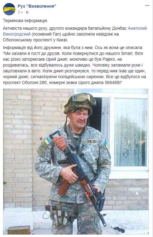 "Рух Визволення" на своей странице в Facebook описал детали задержания. "Информация от его жены, которая была с ним. Вот как она это описала: "Мы заехали в гости к друзьям. Когда вернулись к нашему Smart, возле нас резко затормозил серый джип, возможно это был Pajero, не разглядела, все происходило очень быстро. Мужу заломили руки и затолкали в авто. Когда джип развернулся, то перед ним ехал еще один, черный джип, сигнализируя полицейской сиреной. Все это произошло на проспект Оболони 28б", - говорится в сообщении.