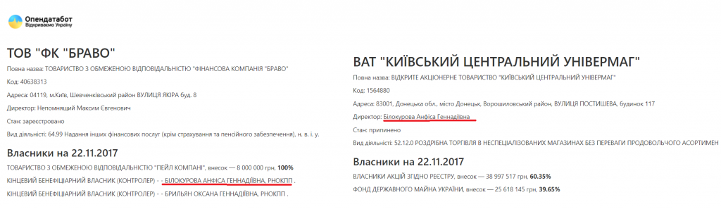 По бумагам ФК «БРАВО» принадлежит Анфисе Билокуровой, известной в качестве менеджера ООО «Эста холдинг» Рината Ахметова, и в 2010-2011 руководившей ОАО «Киевский центральный универмаг» (заняла эту должность после покупки ЦУМа компаниями Ахметова у семьи экс-министра промышленности Украины Валерия Мазура).
