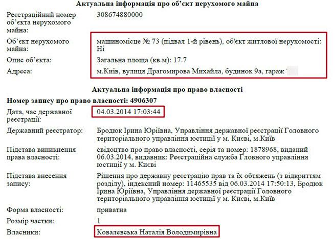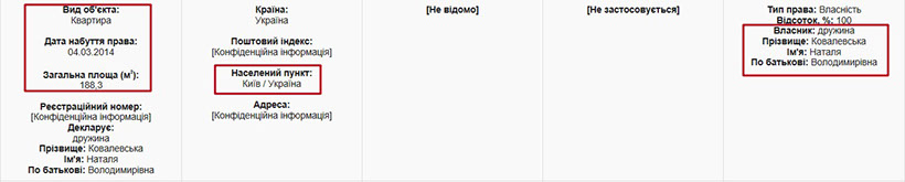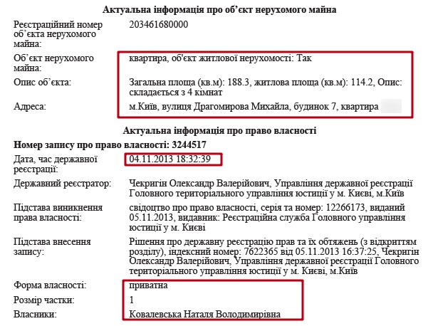 Та найбільш цінним є нерухоме майно Наталії Ковалевської. У її власності є квартира на 188 м², розташована за адресою вулиця Драгомирова, 7 – це один із будинків елітного житлового комплексу «Новопечерські липки». Подібна квартира тут коштує близько 750 тис. дол.